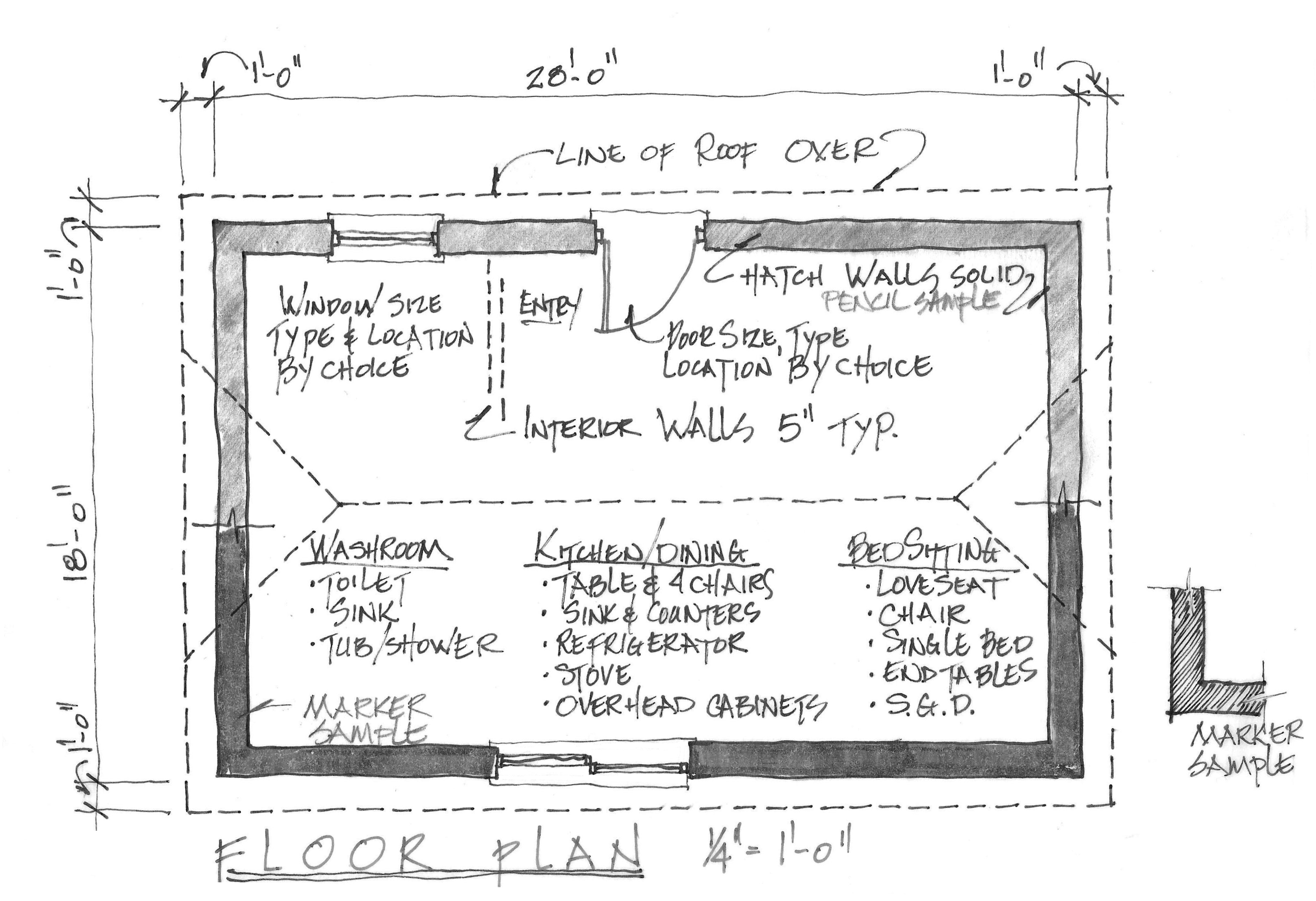 Using professional freehand drawing techniques draw at a scale of 1/4"=1'-0", create a set of architectural drawings of your proposed design solution.